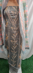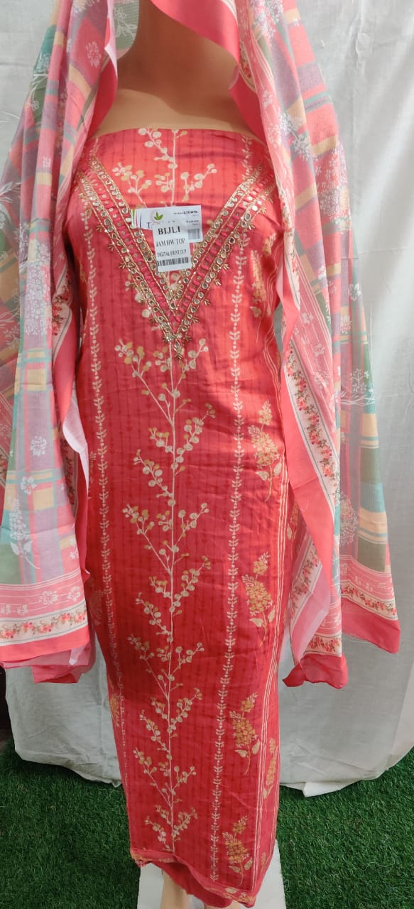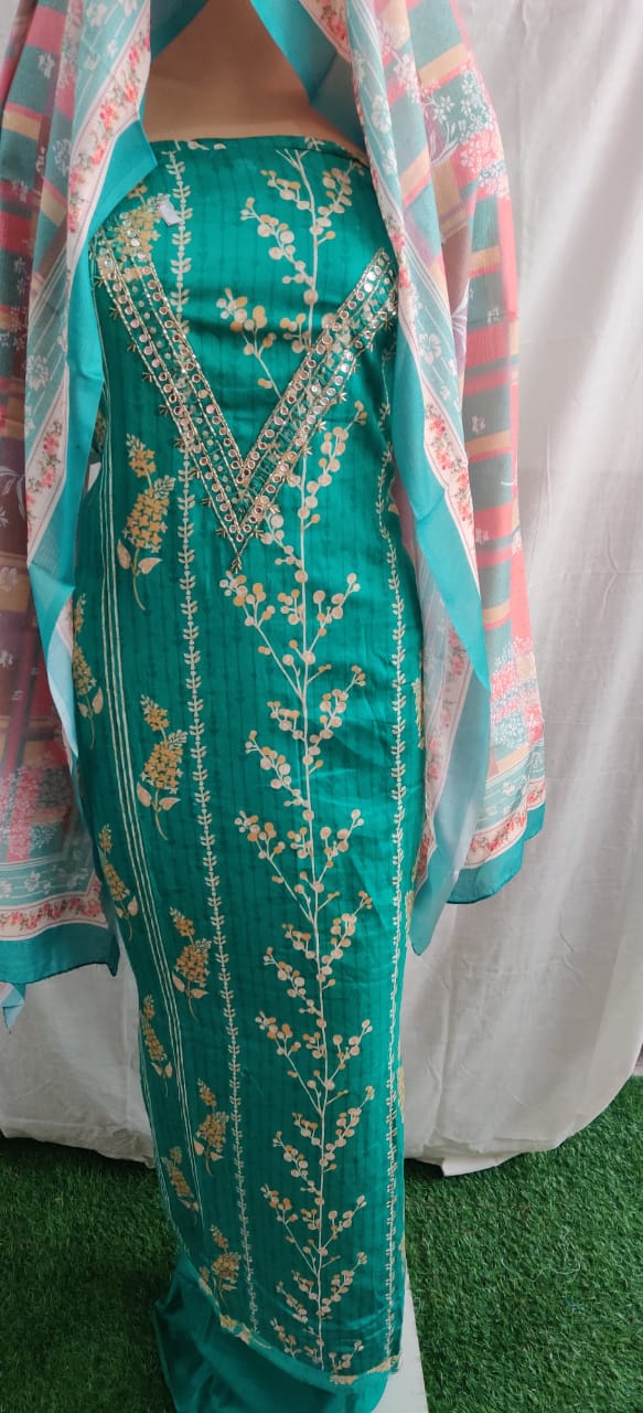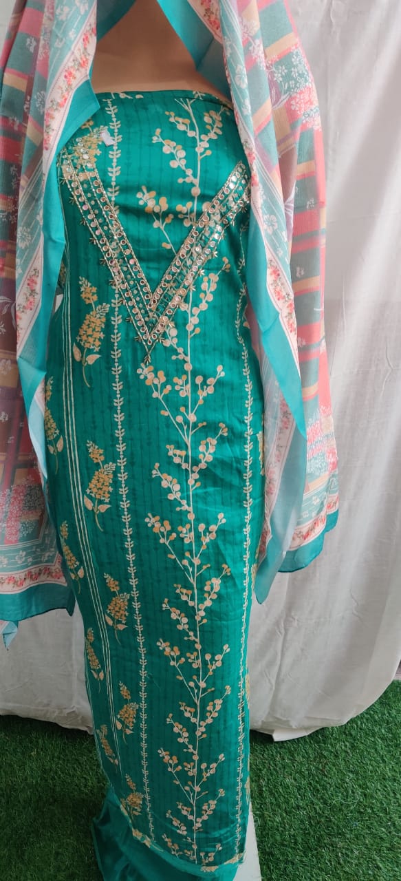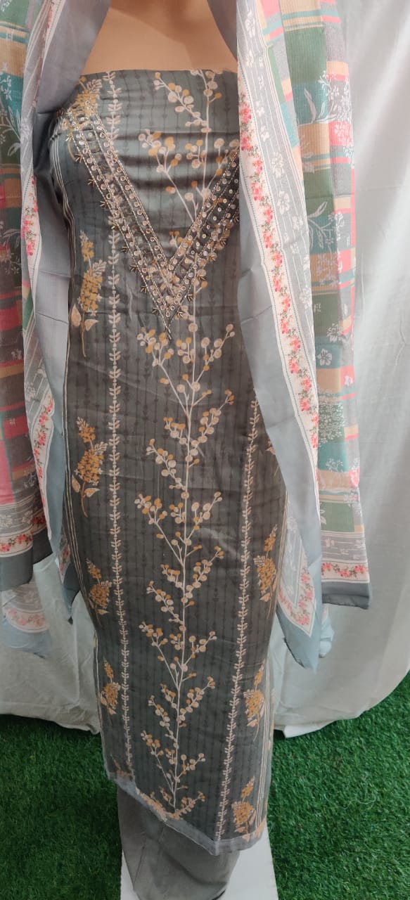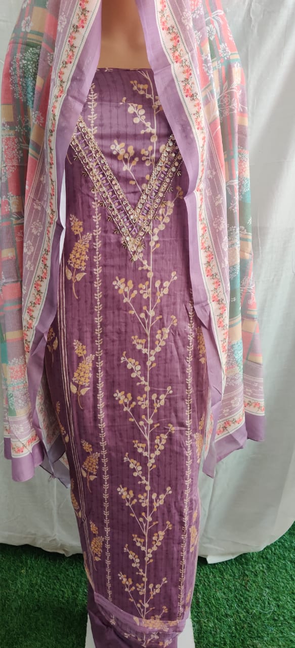 Heavy nack embroidery design and flower print cotton duptta unstitched suit